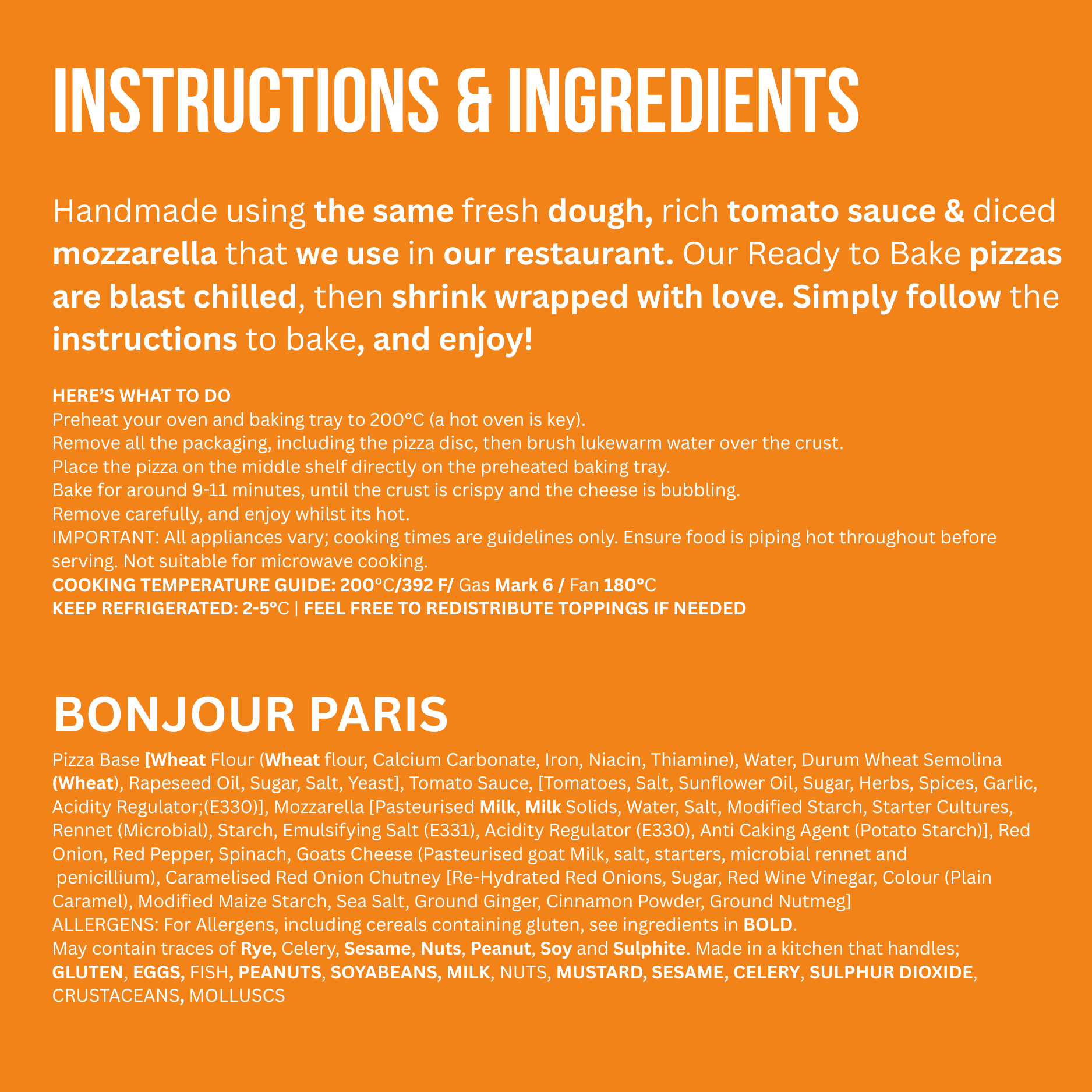 Remove all packaging. Preheat oven to conventional 200°C/ 392°F/ Gas Mark 6/ Fan 180°C. Place pizza directly onto the middle shelf of preheated oven.