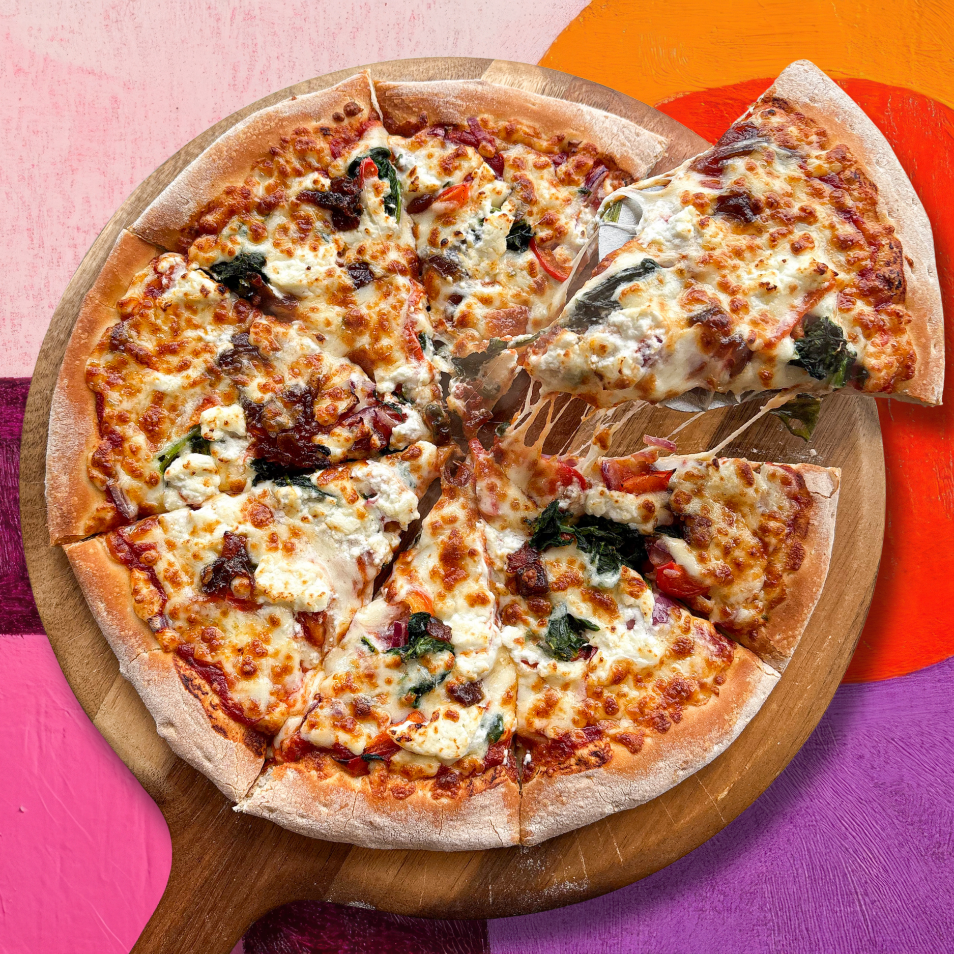 We’re heading straight to the streets of Paris to savour rich, comforting flavours done properly. Creamy, crumbly goat’s cheese meets sweet caramelised onion chutney, balanced with fresh spinach and red peppers. It’s smooth, savoury, and indulgent! The kind of pizza you fall in love with after the very first bite.