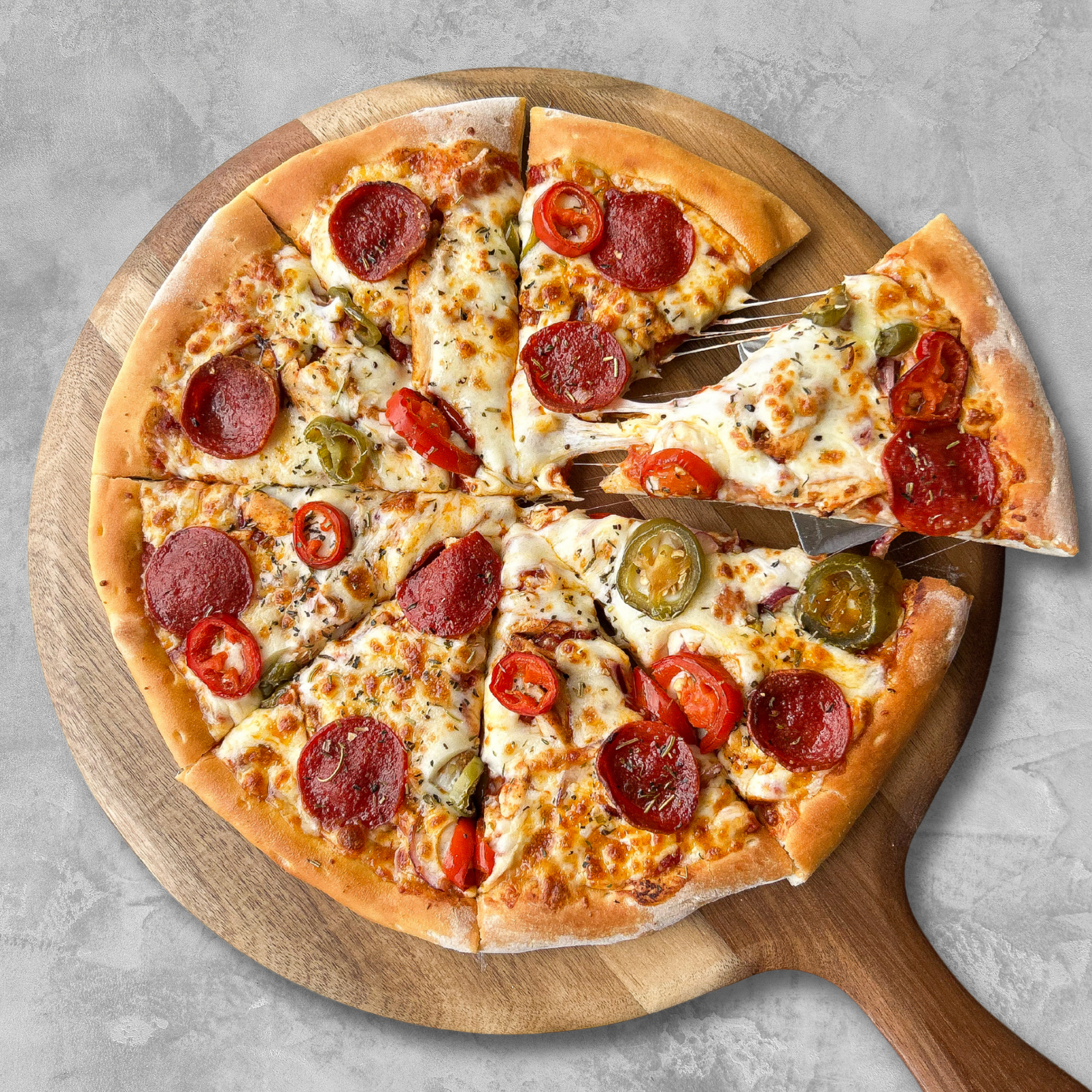 Let’s take a trip to the bustling streets of Delhi, where the smoky heat of tandoori spice rules the grill. We’ve paired tender tandoori chicken with sizzling pepperoni, fiery jalapeños, and a sprinkle of fragrant Italian herbs. The result? A bold East-meets-West creation that brings the sizzle straight to your sli